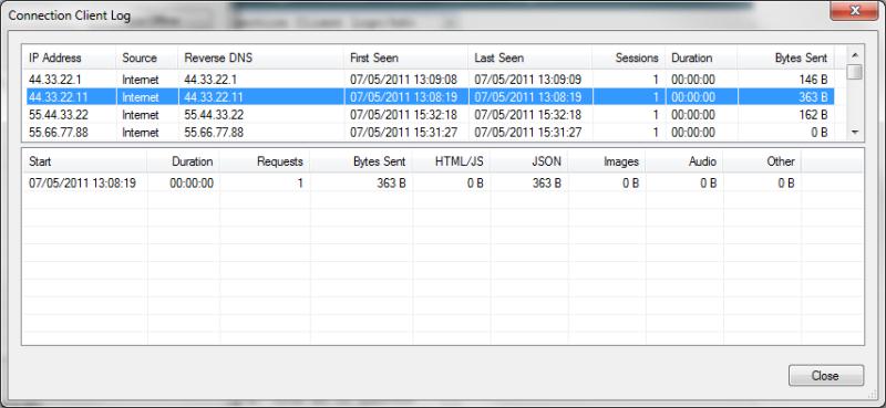 It is split into two halves. The top half is a list of every unique IP address that has connected to the server, along with some information and totals about those connections, whereas the bottom half is a Connection Session Log showing every session from a selected IP address.