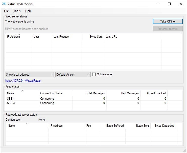 This indicates the current state of the connection to the feed of aircraft data. Normally the server will connect to the data feed as soon as it starts up. You cannot disconnect from the feed manually.