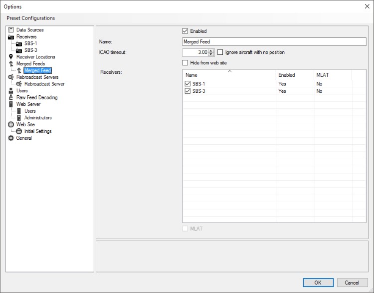This tick box is only enabled when you select a receiver in the Receivers list. Ticking this box tells VRS that the selected receiver is an MLAT feed. The feed calculates positions for aircraft that do not transmit positions themselves. VRS will use these positions even if the feed is not the nominated feed for an aircraft.